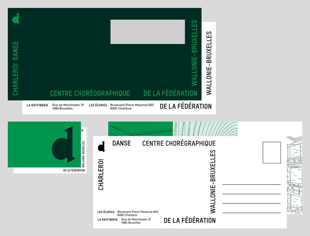 Pour la nouvelle identité de Charleroi Danse ( Bruxelles), nous proposons de retranscrire visuellement le passage d’un mouvement dansé dans des espaces autant scéniques qu’urbains et intimes (la maison). Ce mouvement est transcrit par une longue courbe qui vient troubler l’espace qu’elle traverse. Projet sélectionné en phase finale mais non lauréat.