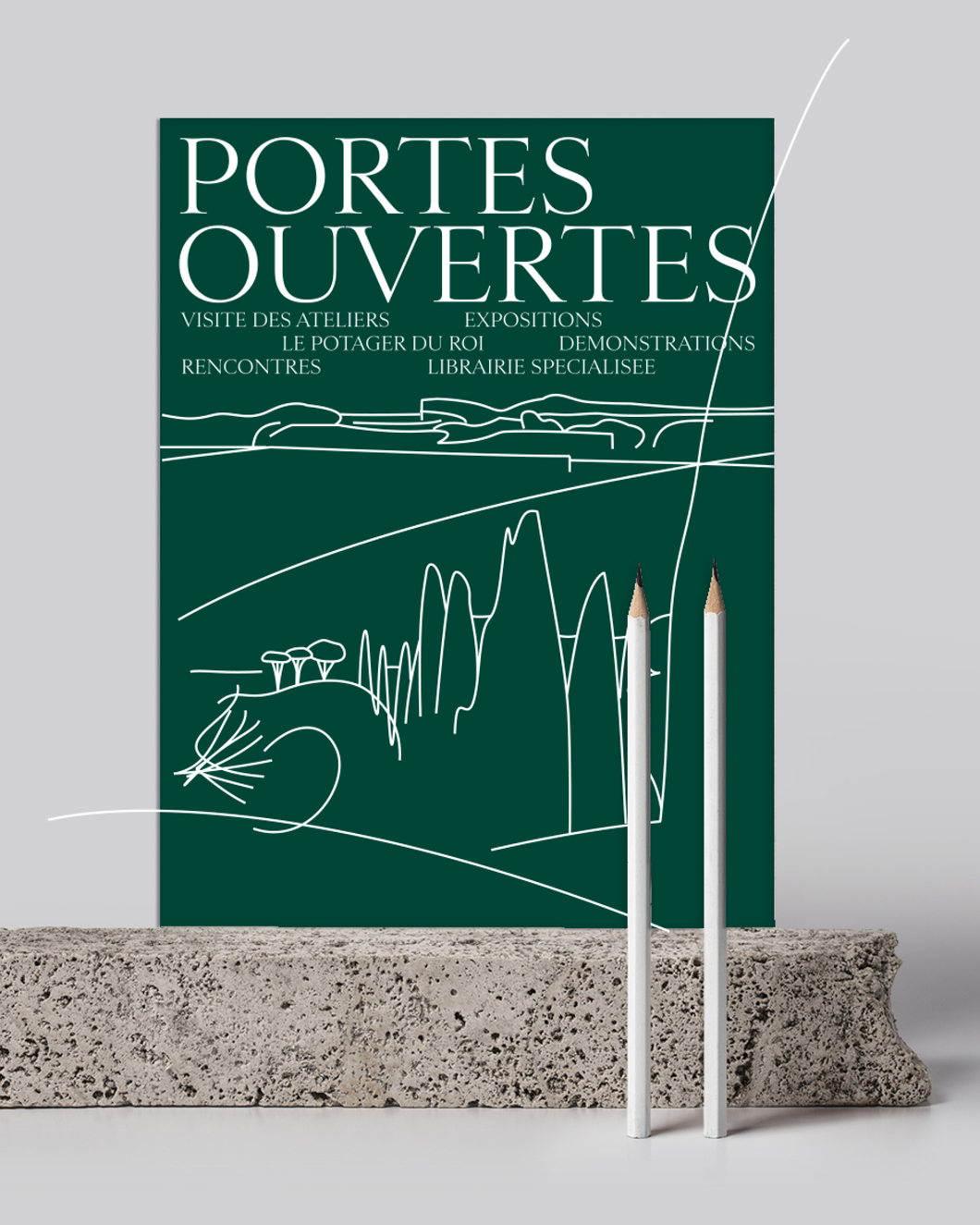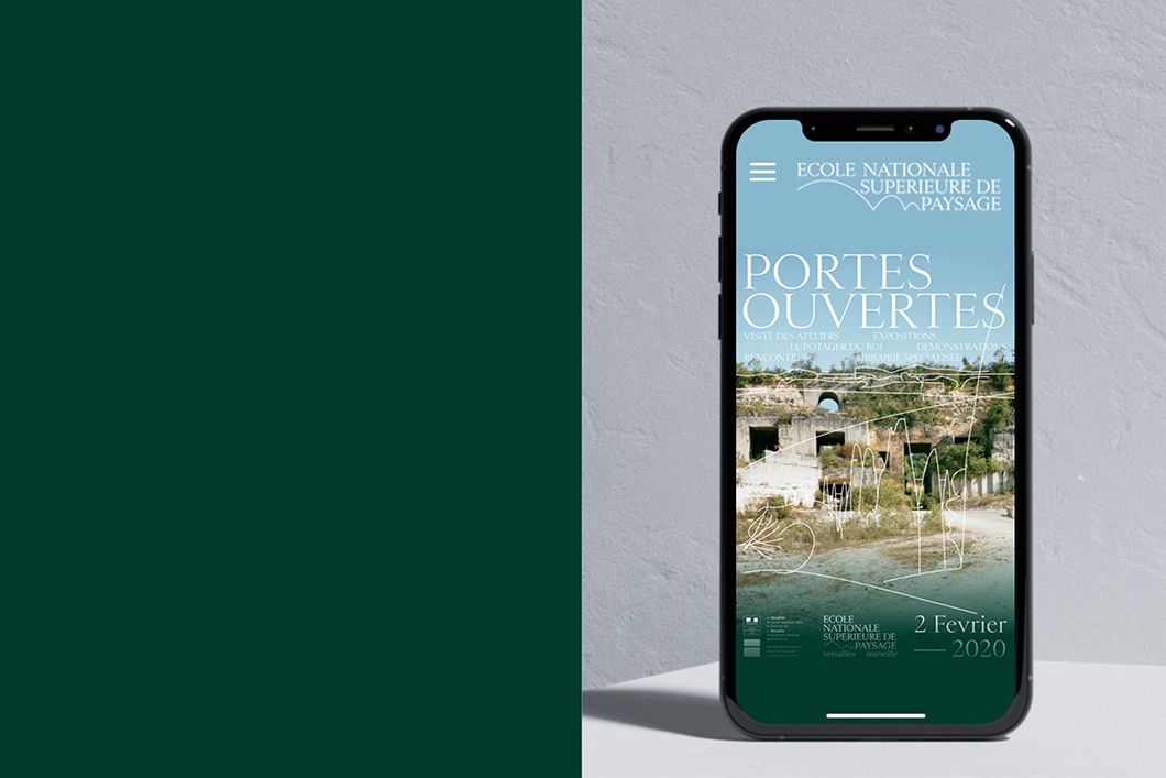 L’identité combine un langage textuel et un langage imagé, celui des croquis des étudiants, du travail de dessin de plans et de projections de paysages. La refonte du logotype de l’ENSpaysage joue sur des ferrages gauche et droite qui amènent une mise‐en‐page atmosphérique, une composition de l’espace basée sur l’horizontalité.