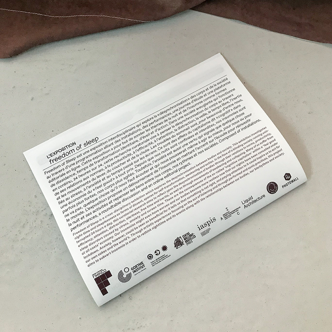 Nous avons réalisé l’identité de la résidence curatoriale sur l’année 2020–2021. Logotype, typographie, site‐web freedomofsleep.online , supports imprimés et signalétique d’exposition.