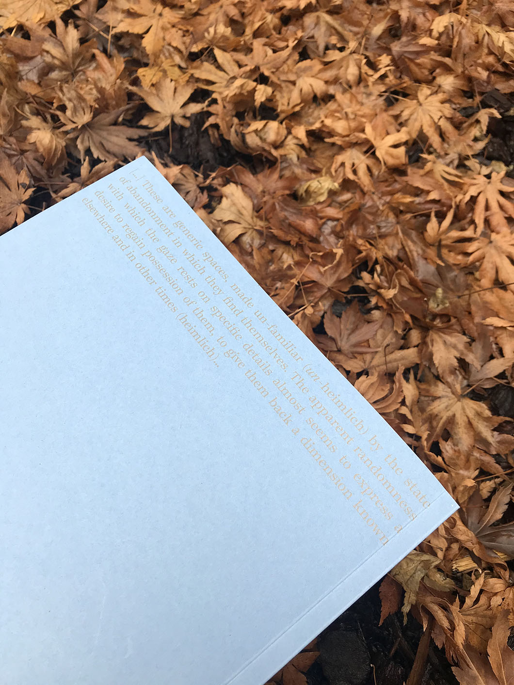 Le catalogue restitue son travail de deux ans sur le village de vacances ENI en phase de reconversion en lieu d’art mais aussi, et en partie, en ruines. Le terme unheimliche, traduit de l’allemand en “étrange”, contient dans sa complexité sémantique le même sentiment d’impuissance et de désorientation que l’on ressent lorsque, en visitant un lieu pour la première fois, on se retrouve face à des éléments qui nous semblent familiers et déclenchent des réactions contrastées comme le calme et la peur.