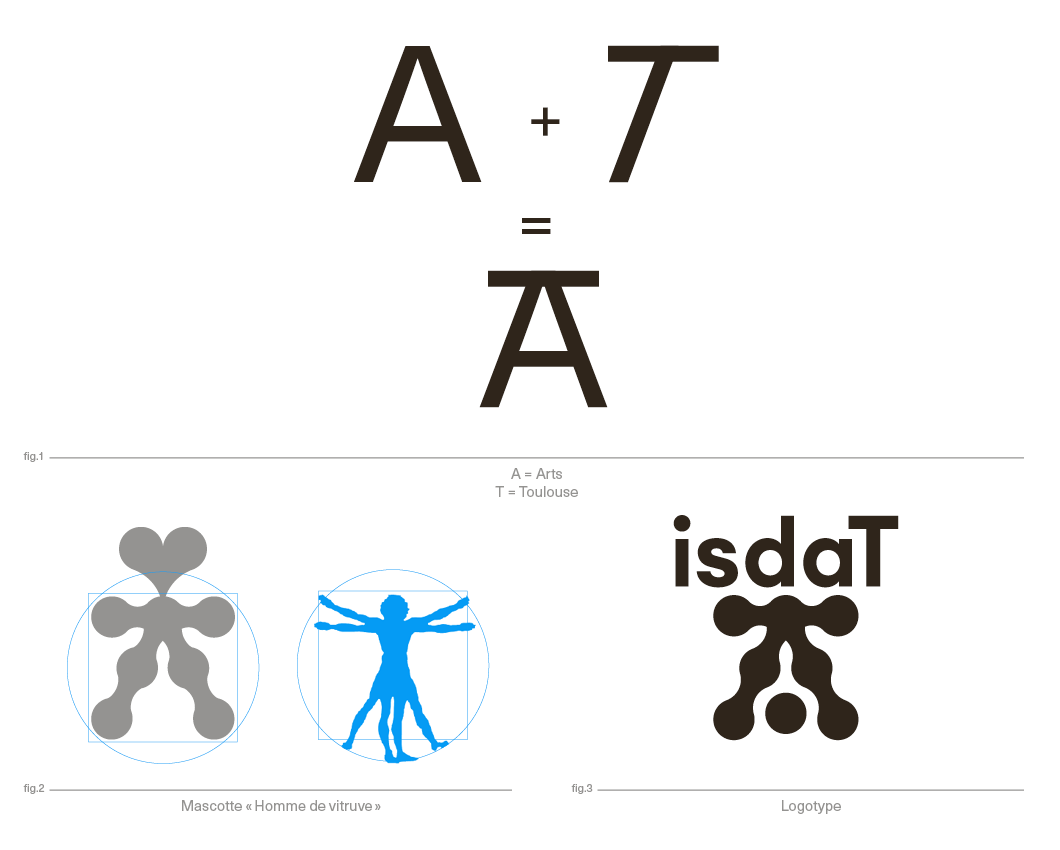 Nouvelle identité autour d’un signe‐totem construit de modules organiques et anthropomorphes. Le signe est composé à partir de modules‐maillons qui s’inter-connectent à partir d’un centre névralgique. L’école se démarque par une formation transversale : les ateliers transversaux entre différents médiums (musique + danse + design graphique, …) représentés ici sous des « labels ». Mascotte : l’homme de Vitruve, l’homme de l’isdaT : allégorie de l’humanisme à l’ère de la mutualisation et de la transversalité.