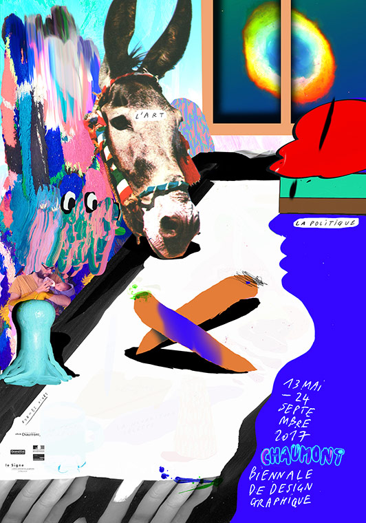 Enfin, notre dernière étude de cas portera sur le travail du collectif Formes Vives à l’occasion de la biennale de design graphique de Chaumont. Pour situer cet événement, il s’agit d’une rencontre qui témoigne et défend la création contemporaine du graphisme, en donnant davantage de liberté d’expression aux designers. En 2017, ils réalisent l’affiche de l’événement comme un manifeste du partage et une construction collective d’une image. Le collectif souhaitait amener une réflexion sur la manière de produire ce visuel :
