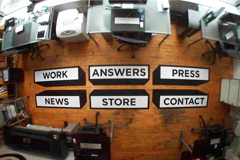 Dans un tout autre registre, il semble pertinent de s’intéresser au travail du designer graphique Stefan Sagmeister, pour la singularité de sa démarche et la représentation médiatisée du réel avec les captures vidéo de son atelier. Ce projet, commencé dans les années 2000, se matérialisait par un enregistrement vidéo constant des employés de son agence. (((Page d’accueil du site de Sagmeister, https://www.youtube.com/watch?v=qTg6Gl3gD8M (consulté le 23 mai)))) Le travail quotidien et collectif était filmé 24 heures sur 24 à l’aide d’une caméra fixée au plafond. L’activité du studio était donc retranscrite en direct, sur la page d’accueil du site web, afin de créer un lien continuel entre les visiteurs du site et les designers. Quant à la navigation sur ce même site web, elle se faisait via des « boutons » en vinyle collés sur le plancher.