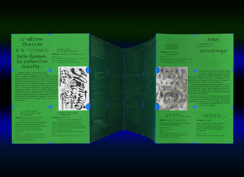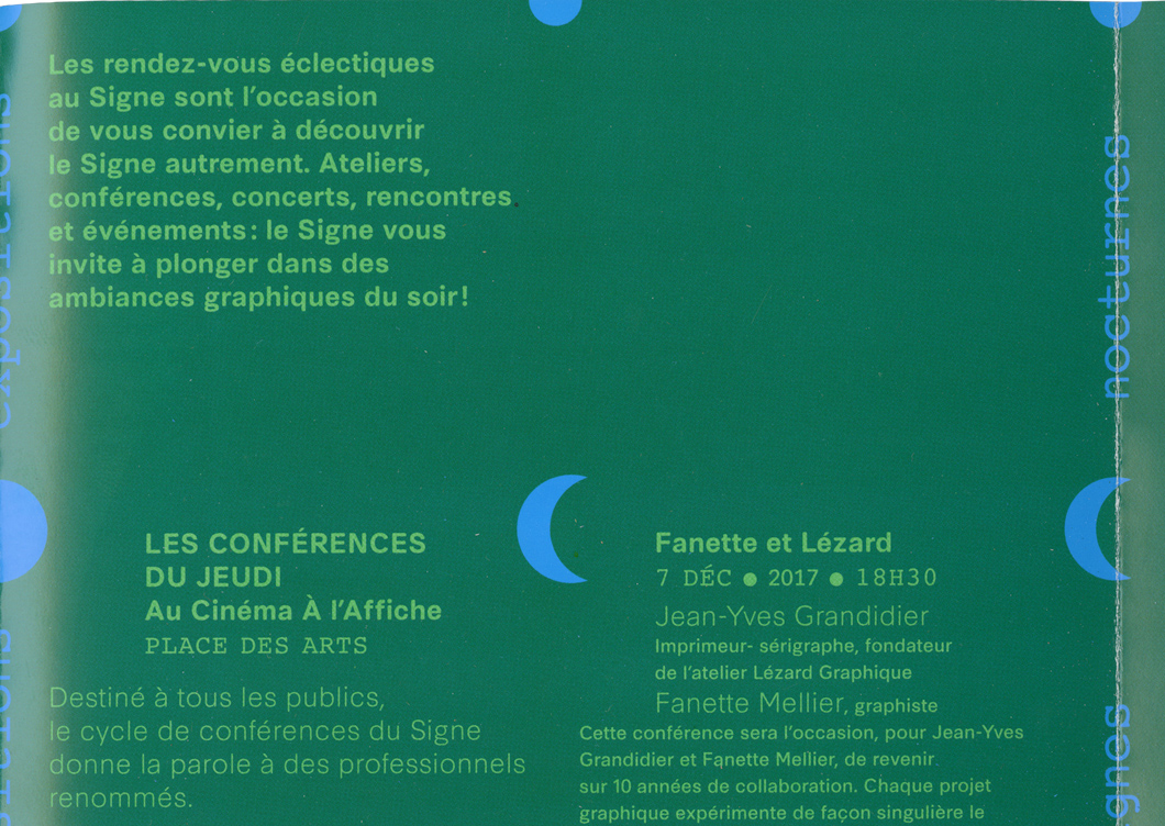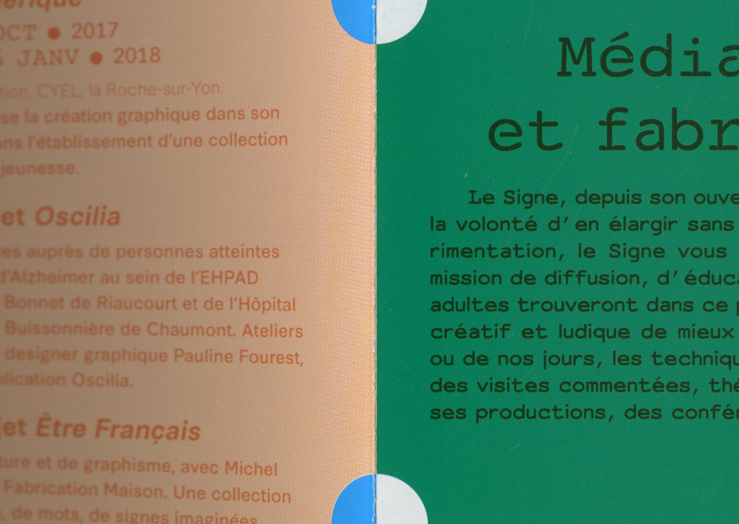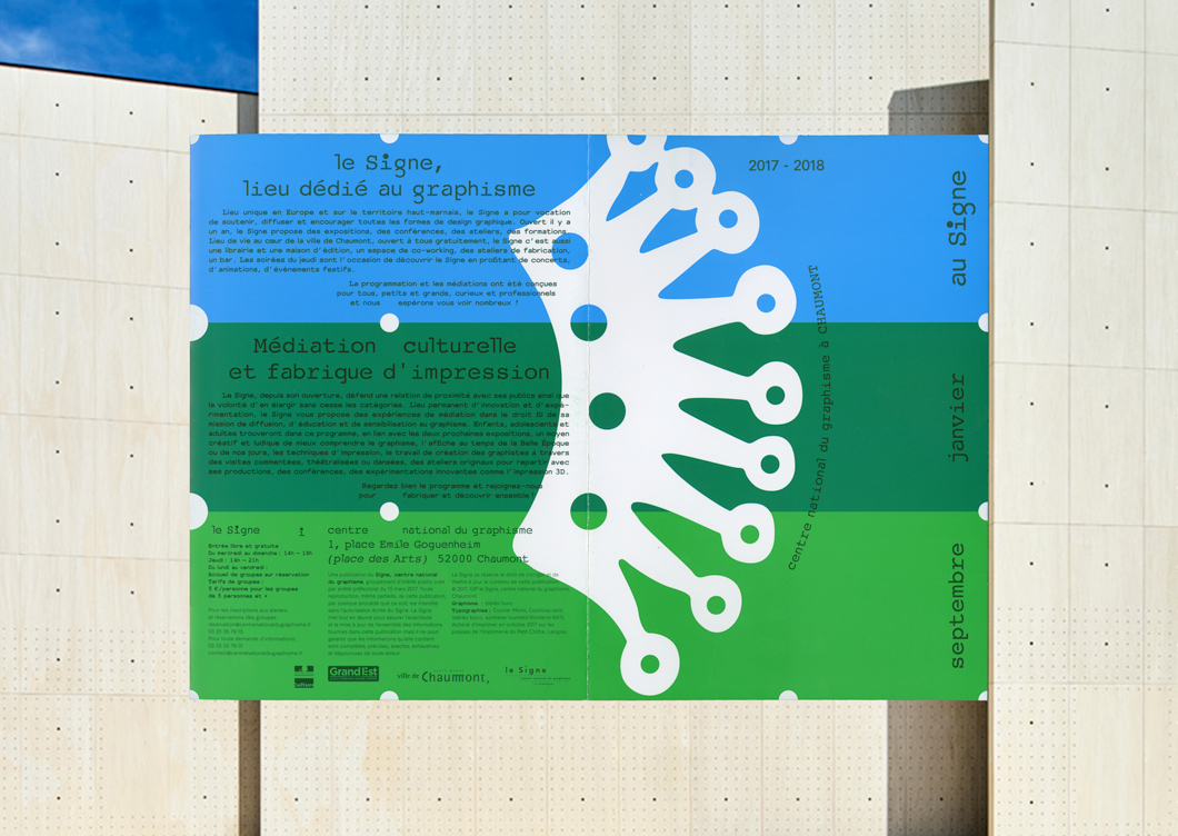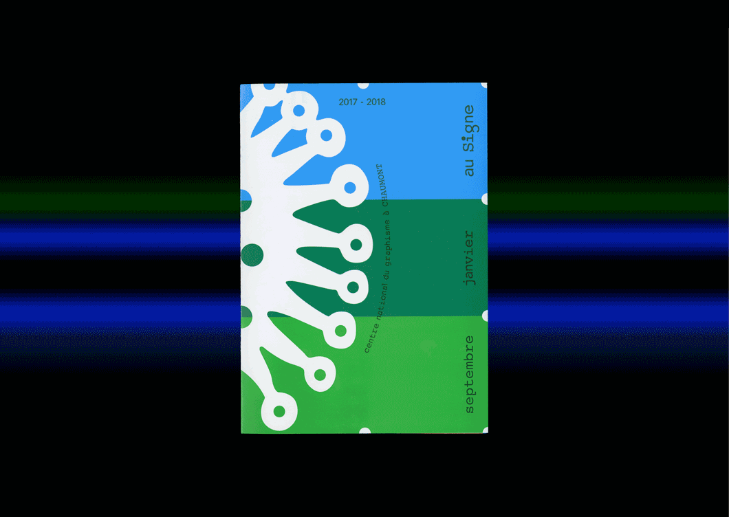 Le Signe, centre national culturel dédié exclusivement à la promotion et à la diffusion du design graphique, a ouvert ses portes en 2016 à Chaumont. Nous réalisons le premier programme de saison culturelle 2017–2018. Nous avons voulu ancrer l’identité du Lieu au travers d’une part son architecture, et plus particulièrement aux trames de points, typologie mise‐en‐place par les architectes Moatti & Rivière, et de l’autre le symbole de la couronne du festival de graphisme de Chaumont.