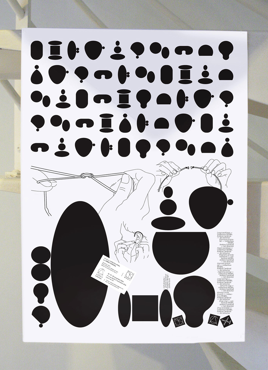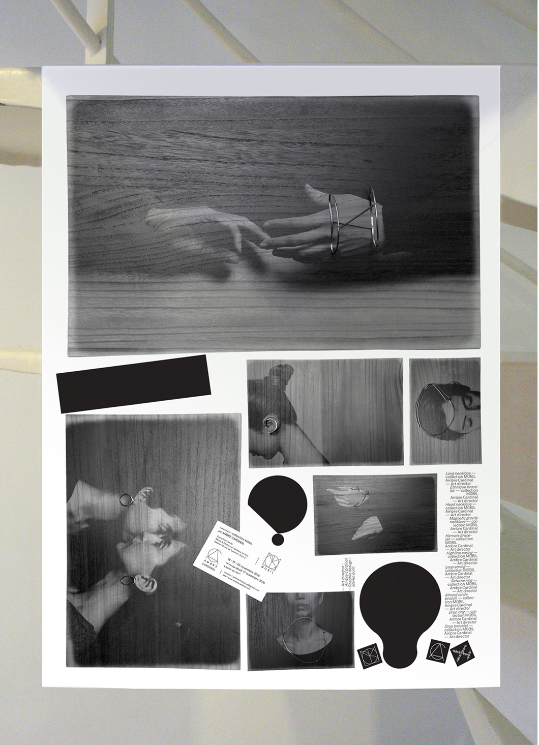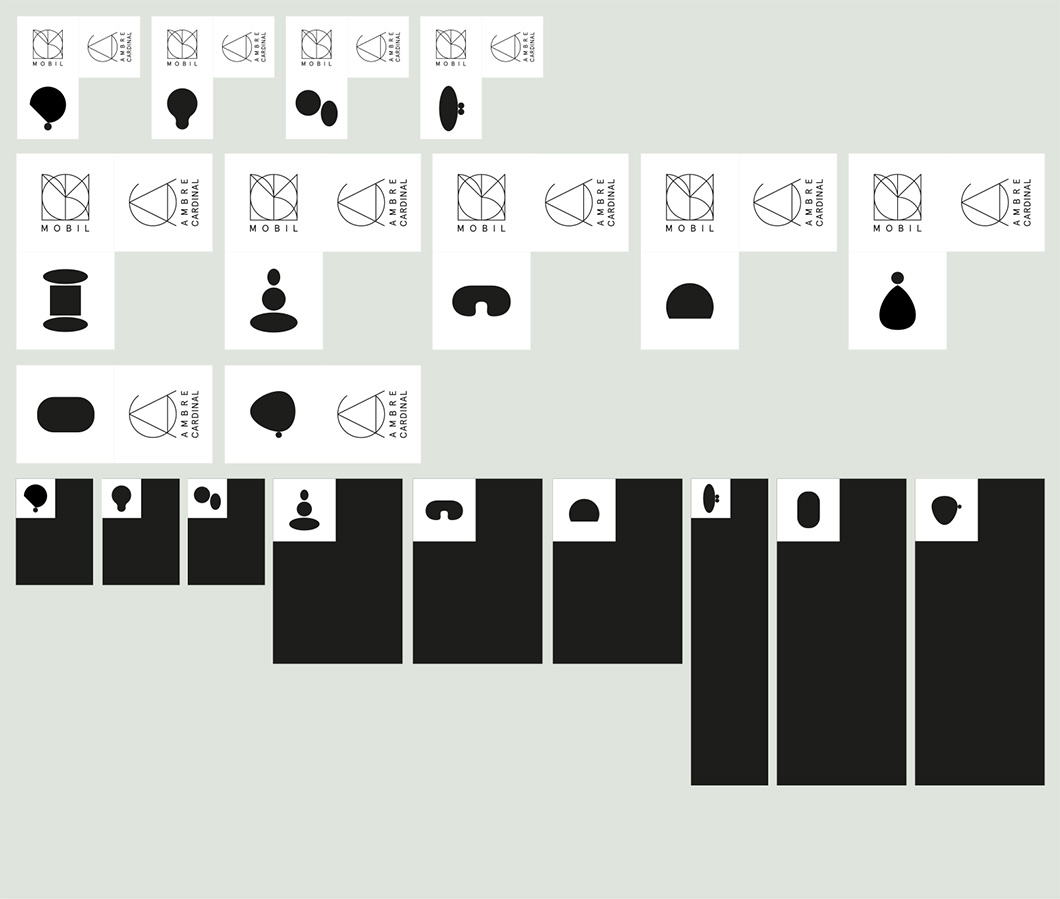 Création de l’identité visuelle pour la collection Mobil de Ambre Cardinal, créatrice de bijoux contemporains. Fortement inspirée des théories constructivistes postmodernes du début du XXe siècle, la collection repose sur des jeux de construction et d’équilibre entre le corps et le bijoux. Le logotype, construit sur une grille circulaire, reflète ce parti‐pris. Cette identité se décline sur un second logo – celui de la créatrice -, une carte de visite, des affiches, des cartes postales ainsi que sur les packagings des bijoux.