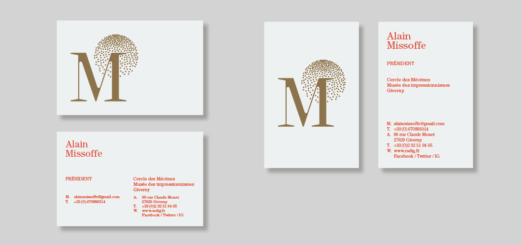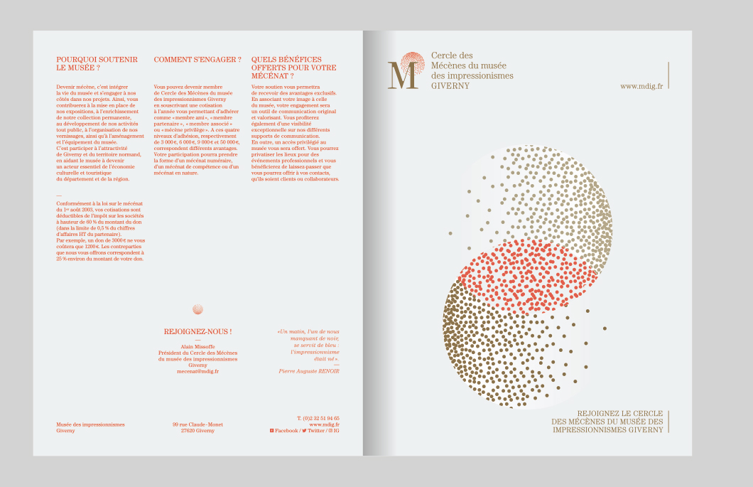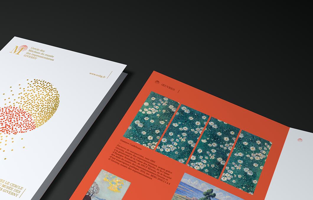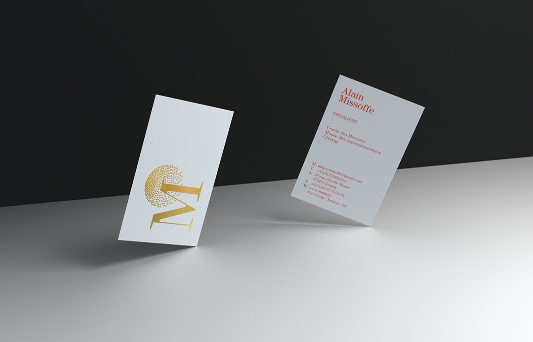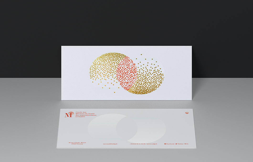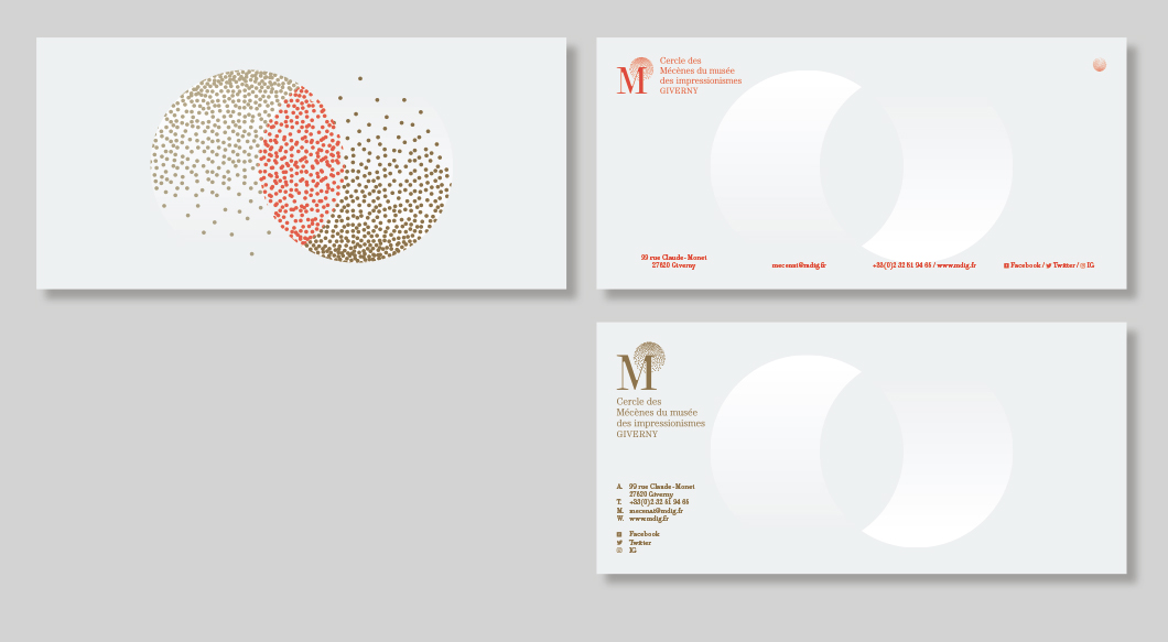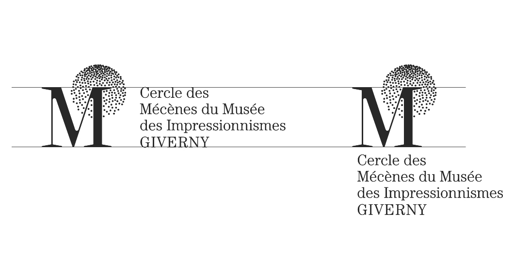 Identité visuelle du Cercle des Mécènes des impressionnismes Giverny. La combinaison du M des Mécènes et du I des impressionnismes est auréolée du point du i, devenu constellation.