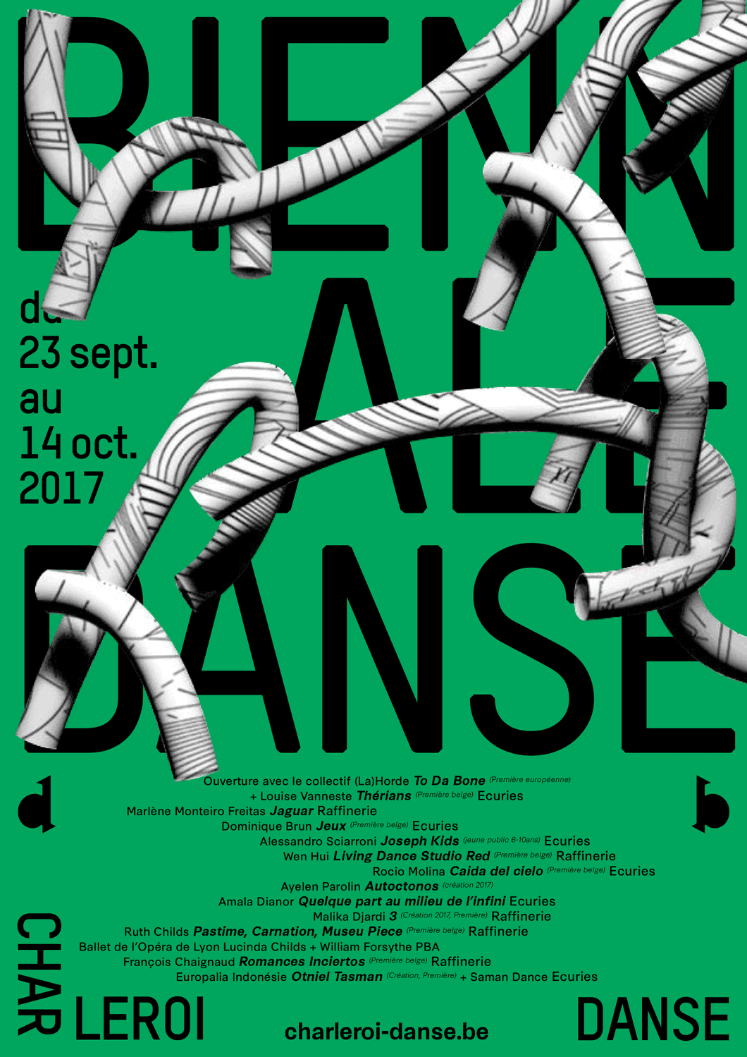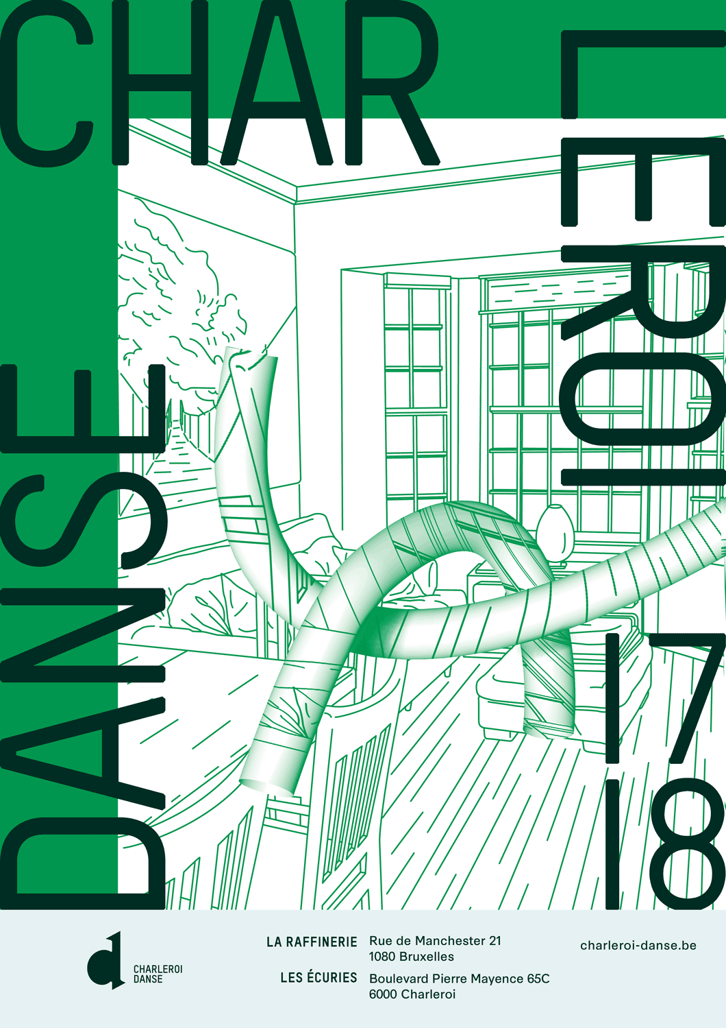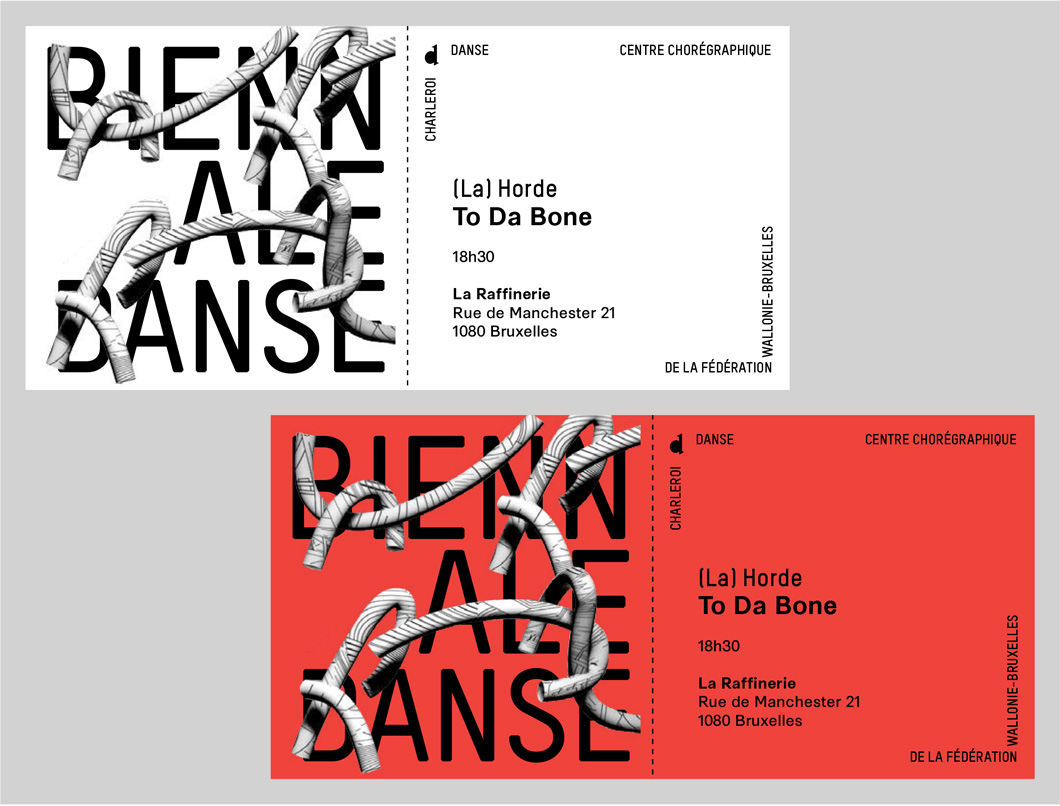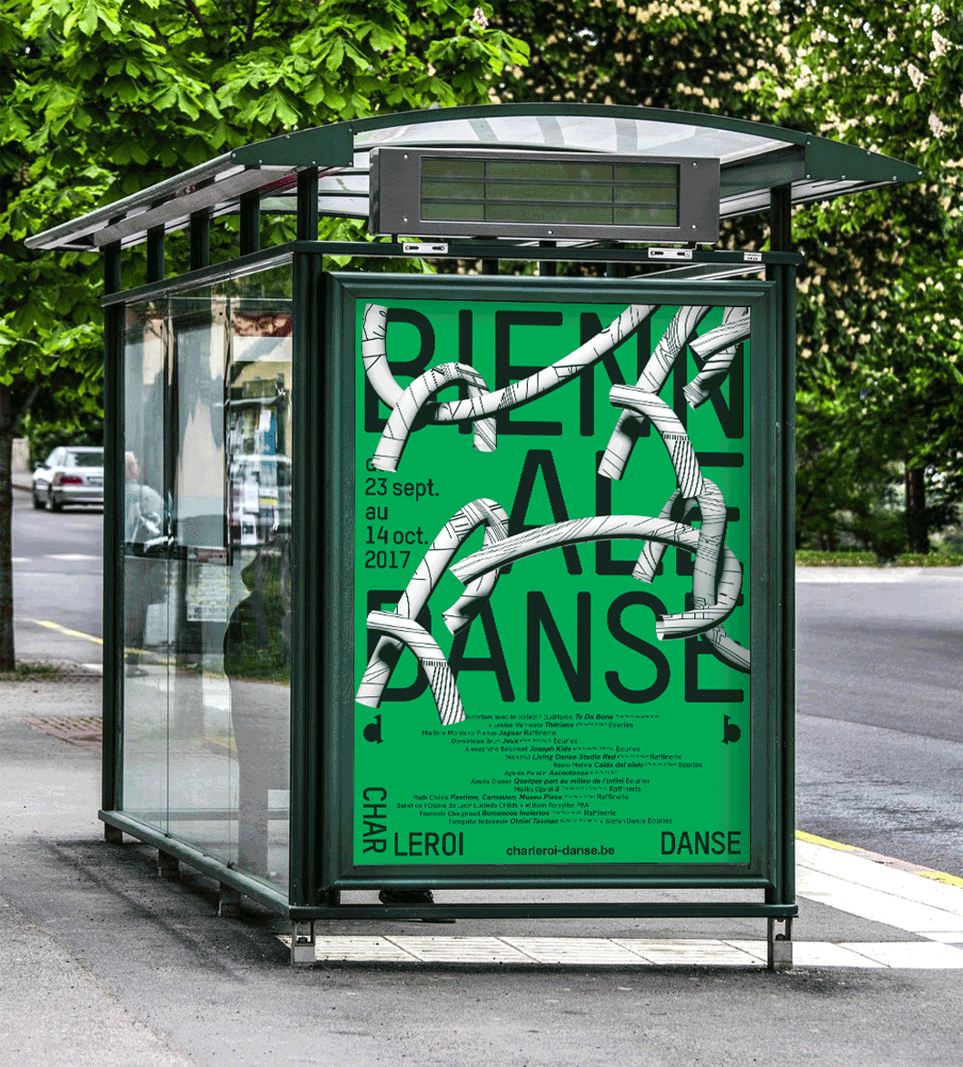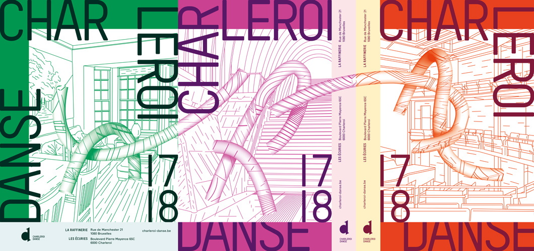 Pour la nouvelle identité de Charleroi Danse ( Bruxelles), nous proposons de retranscrire visuellement le passage d’un mouvement dansé dans des espaces autant scéniques qu’urbains et intimes (la maison). Ce mouvement est transcrit par une longue courbe qui vient troubler l’espace qu’elle traverse. Projet sélectionné en phase finale mais non lauréat.