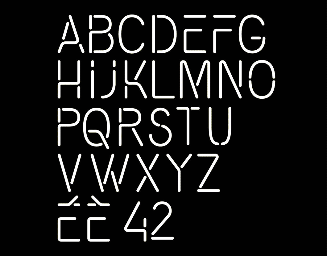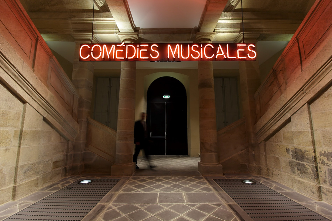 Création d’un lettrage néon pour la scénographie de l’exposition « Comédies musicales » du CNCS. Création d’une typographie stencil spécifique au sujet de la comédie musicale et qualibrée pour le façonnage en néon. Centre national du costume de scène . 2018 . Moulins.