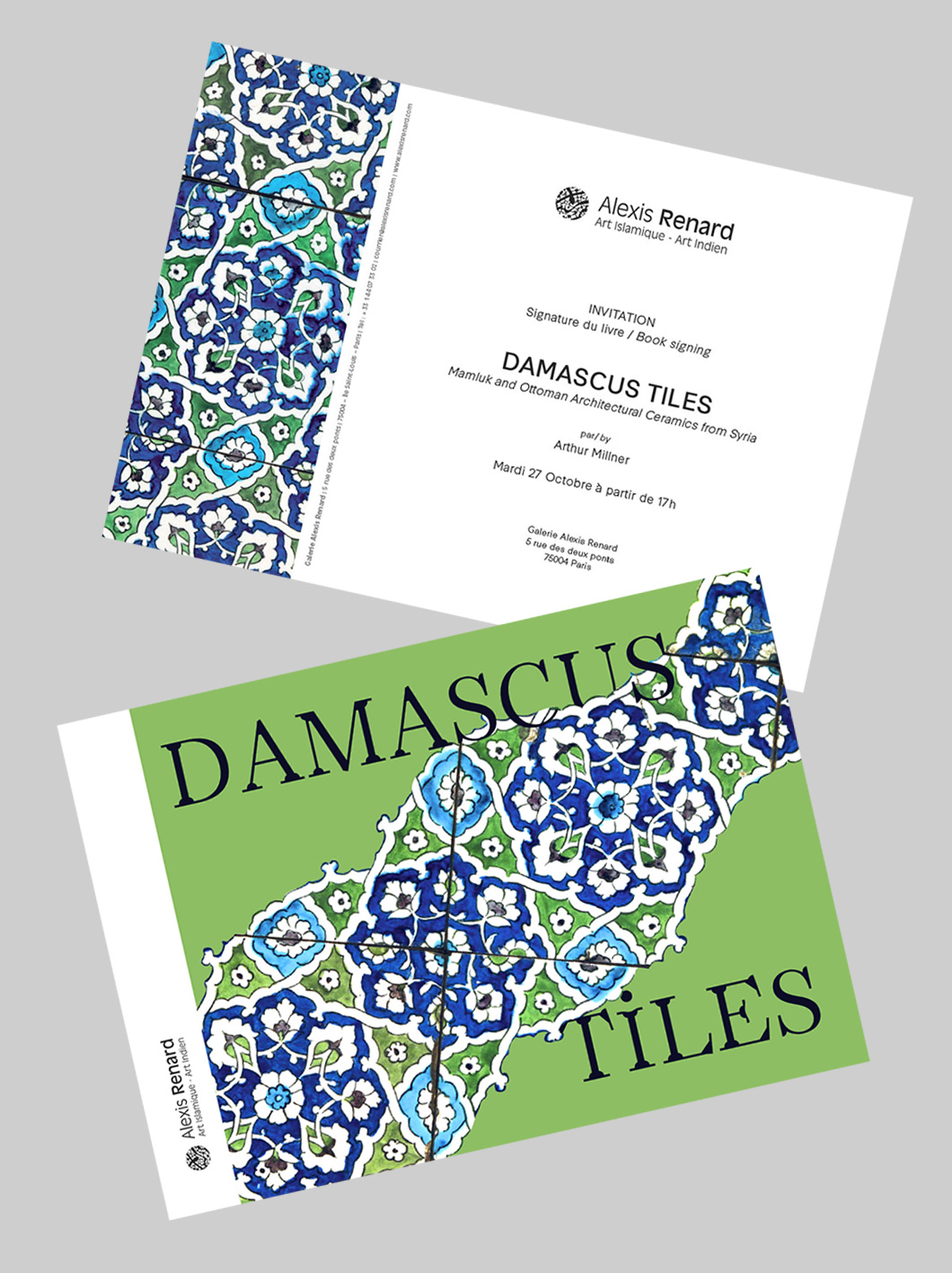 Design du carton d’invitation à l’occasion du lancement du livre “Damascus Tiles” Alexis Renard, galerie d’art Islamique et Indien . 2016