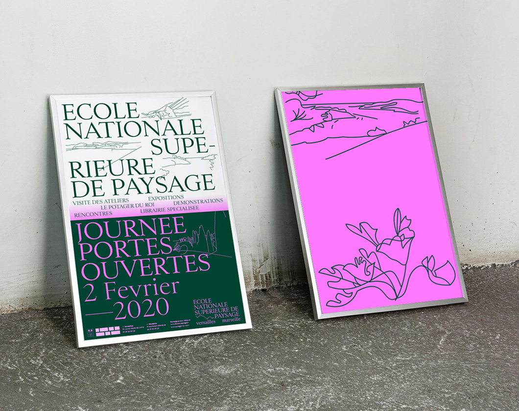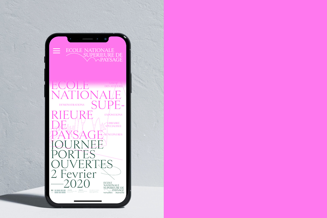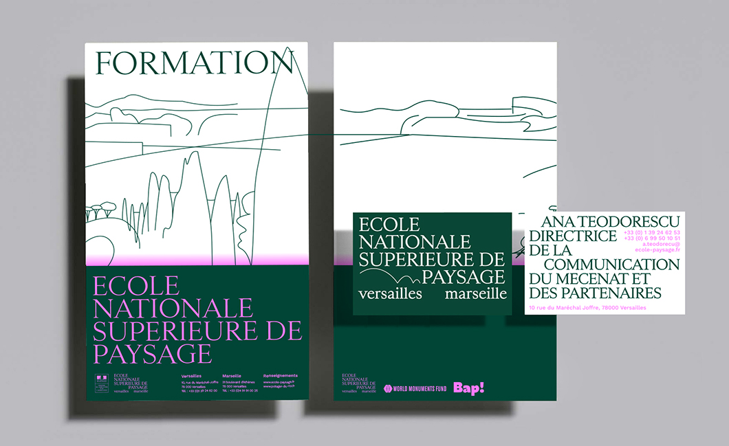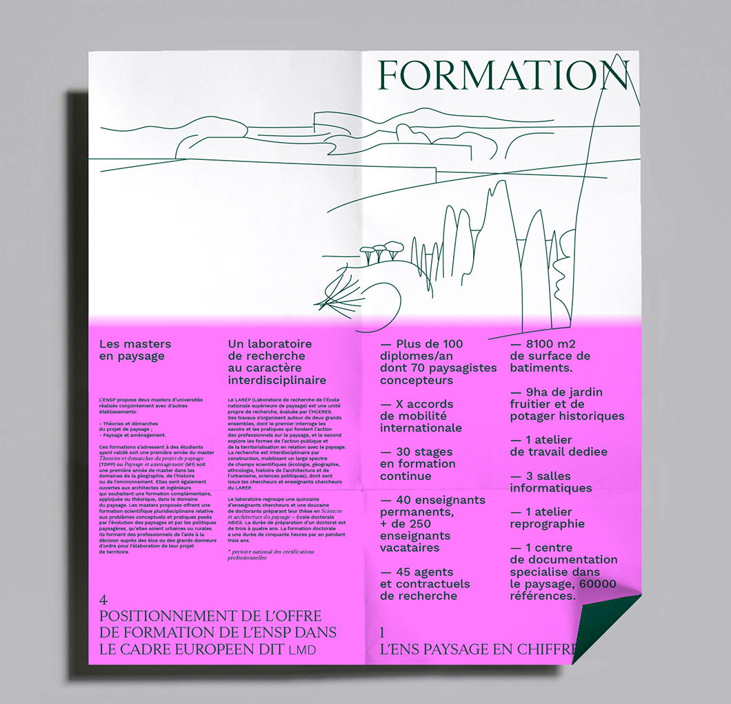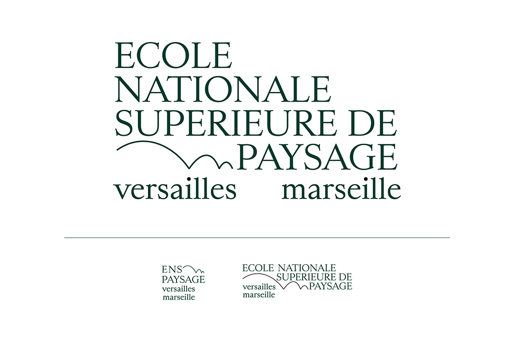 L’identité combine un langage textuel et un langage imagé, celui des croquis des étudiants, du travail de dessin de plans et de projections de paysages. La refonte du logotype de l’ENSpaysage joue sur des ferrages gauche et droite qui amènent une mise‐en‐page atmosphérique, une composition de l’espace basée sur l’horizontalité.