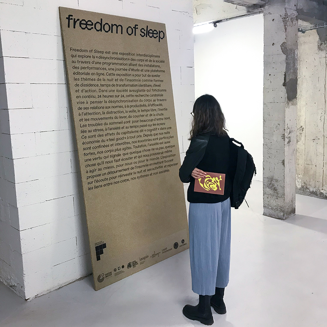 Freedom of Sleep est une exposition interdisciplinaire initié par Anabelle Lacroix, qui explore la « désynchronisation » des corps et de la société au travers d’une programmation alliant des installations, des performances, une journée d’étude et une plateforme éditoriale en ligne. Cette exposition a pour but de sonder les thèmes de la nuit et de l’insomnie comme formes de dissidence, temps de transformation identitaire, d’éveil et d’action.