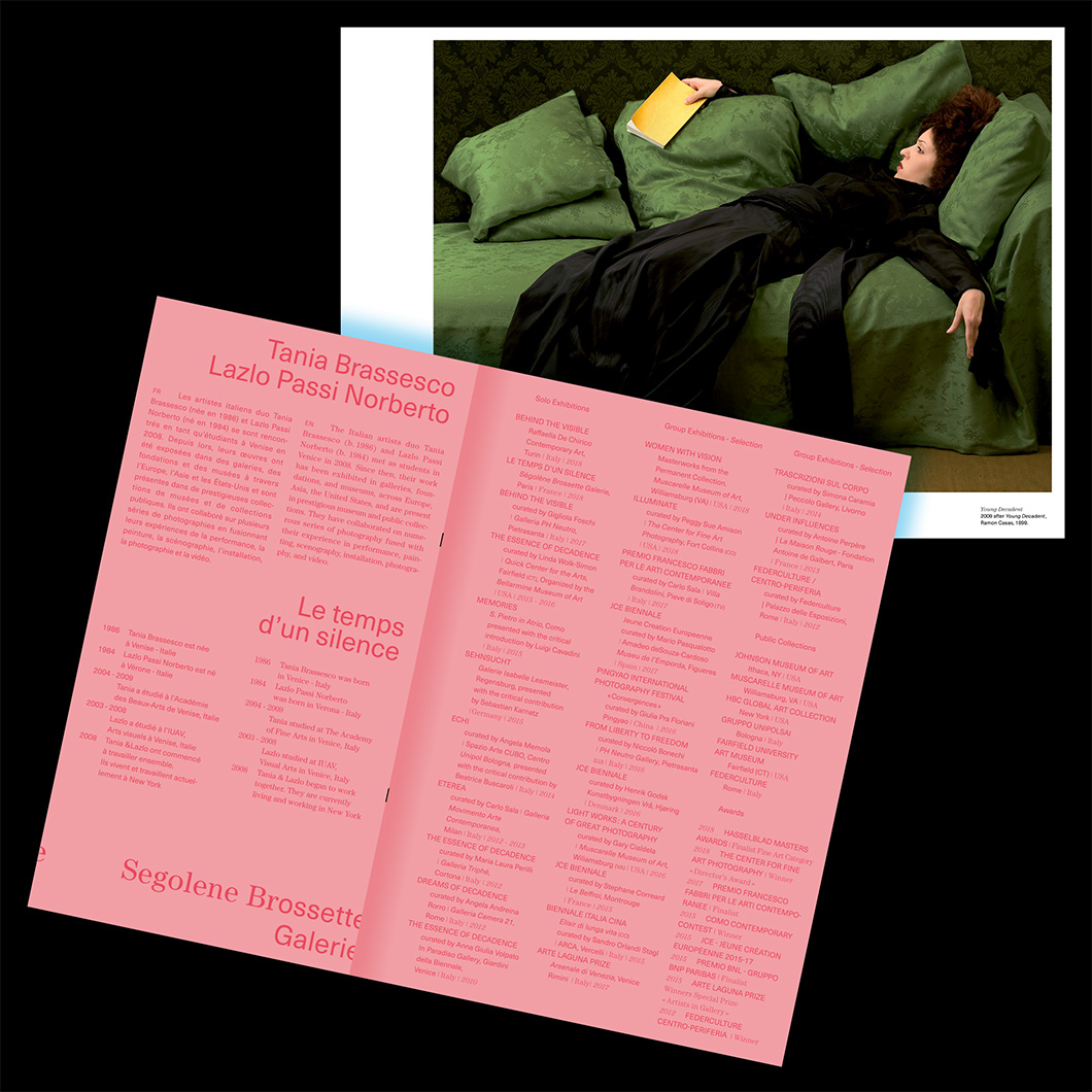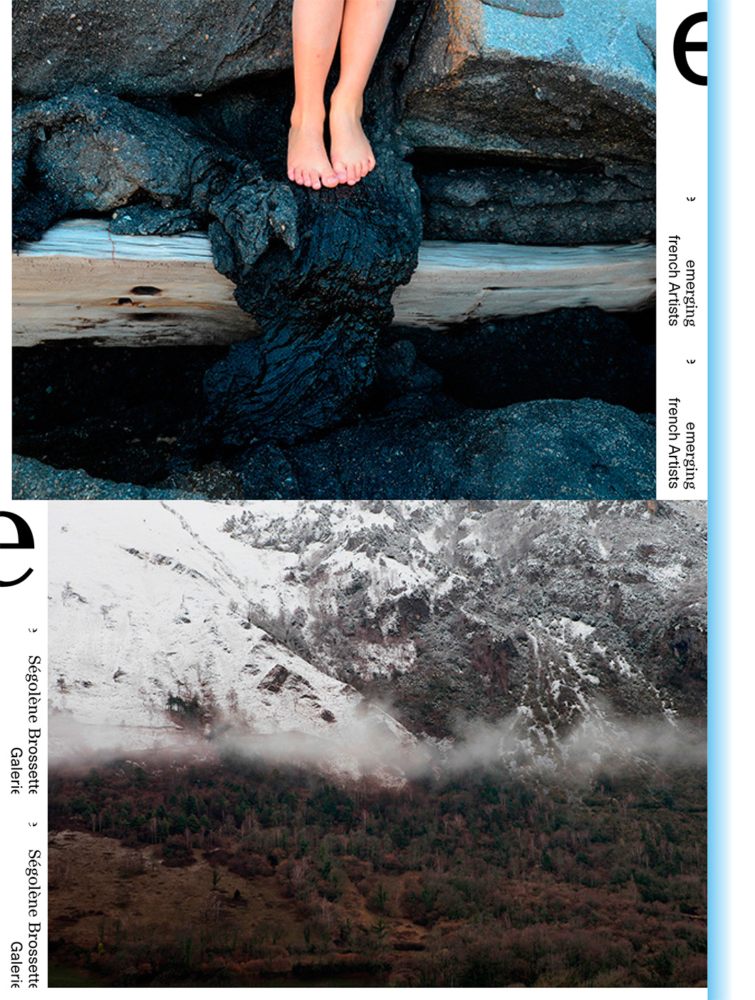 Son commissariat se concentre principalement autour du médium de la photographie et de la sculpture. L’élément naturel, atmosphérique, traverse les œuvres commissionnées. Nous avons basé sa nouvelle identité sur l’idée de l’horizon et de l’organique tout en maintenant une grande simplicité dans les outils et typographie mis‐en‐place. Le logotype se décline en trois versions. Il est composé de deux typographies ; l’une à empattements, la ITC Century et une linéale, la Neue Haas Unica Pro. Elles représentent le travail subtil et sensible du photographe, le passage du minéral à l’organique. Le « e » tronqué est le centre circulaire de la propagation. Les cartes de visite recto/verso illustrent la double casquette de Ségolène, à la fois commissaire d’artistes et galeriste. Les cartes créent un motif une fois accolées les unes à côté des autres. Le passage du recto au verso se fait avec la lettre «e» tronquée, renforçant ainsi l’idée du passage horizontal.