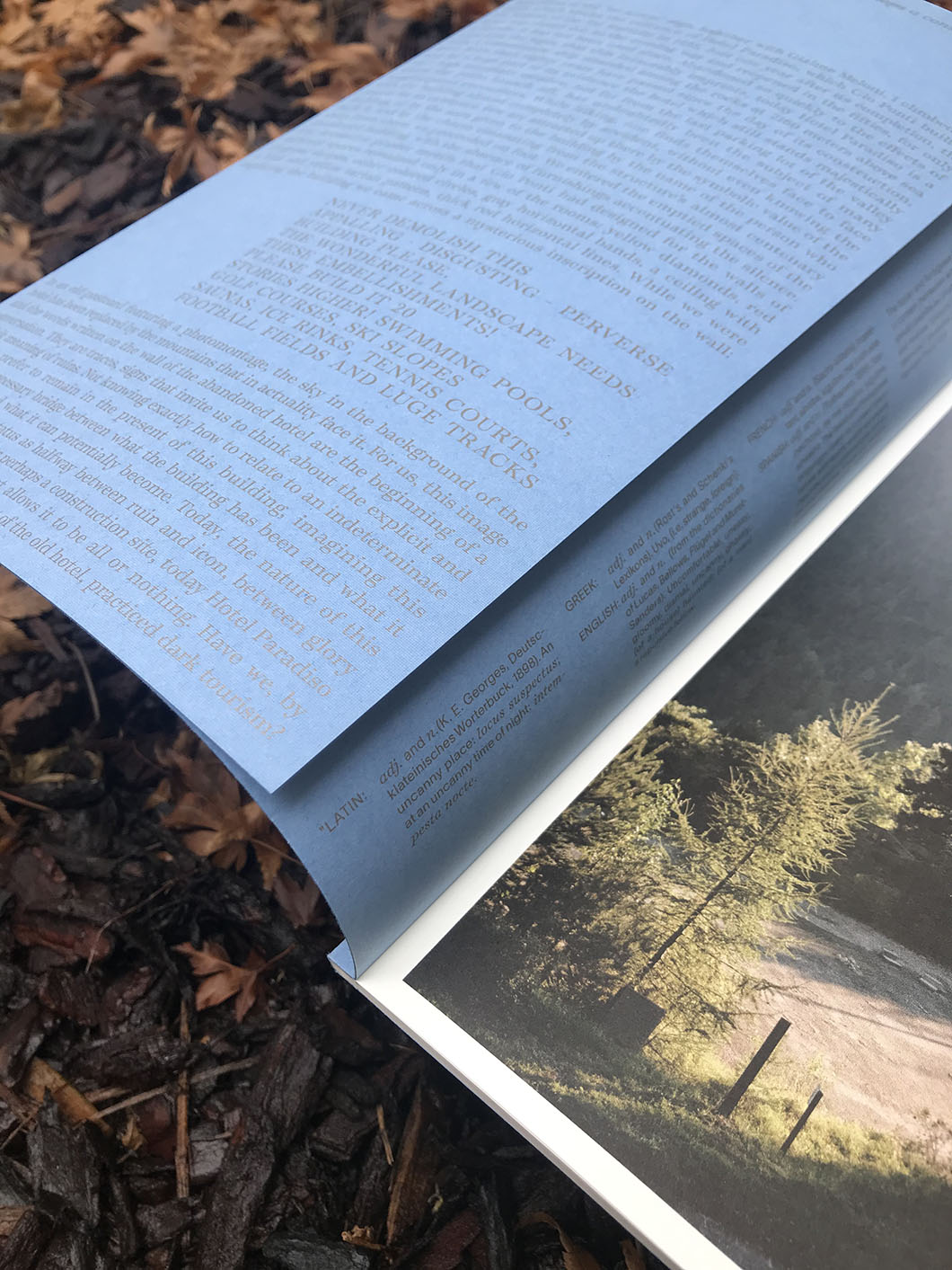 Le catalogue restitue son travail de deux ans sur le village de vacances ENI en phase de reconversion en lieu d’art mais aussi, et en partie, en ruines. Le terme unheimliche, traduit de l’allemand en “étrange”, contient dans sa complexité sémantique le même sentiment d’impuissance et de désorientation que l’on ressent lorsque, en visitant un lieu pour la première fois, on se retrouve face à des éléments qui nous semblent familiers et déclenchent des réactions contrastées comme le calme et la peur.
