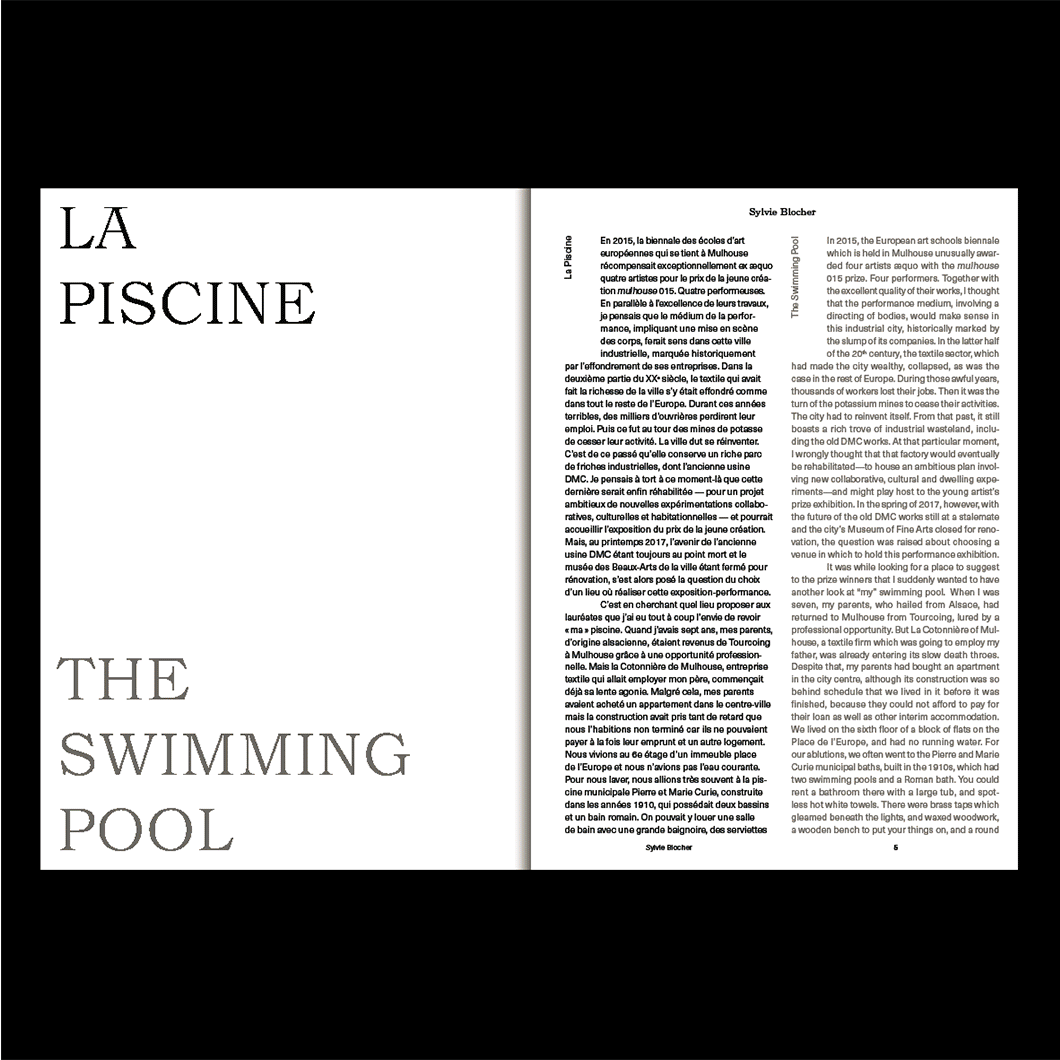 GRAND BASSIN est la publication qui retrace les performances simultanées de Yuni Hong Charpe, Agathe Berthaux Weil et Aurélie Ferruel/Florentine Guédon qui se sont tenues dans les bains de Mulhouse en juin 2017.