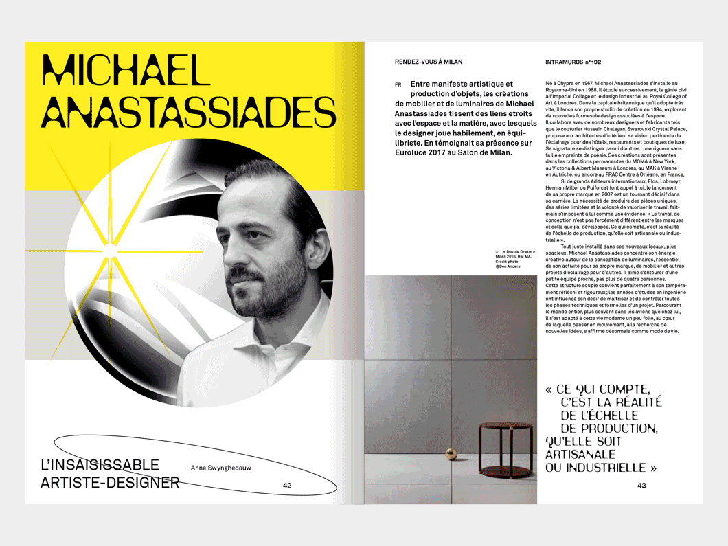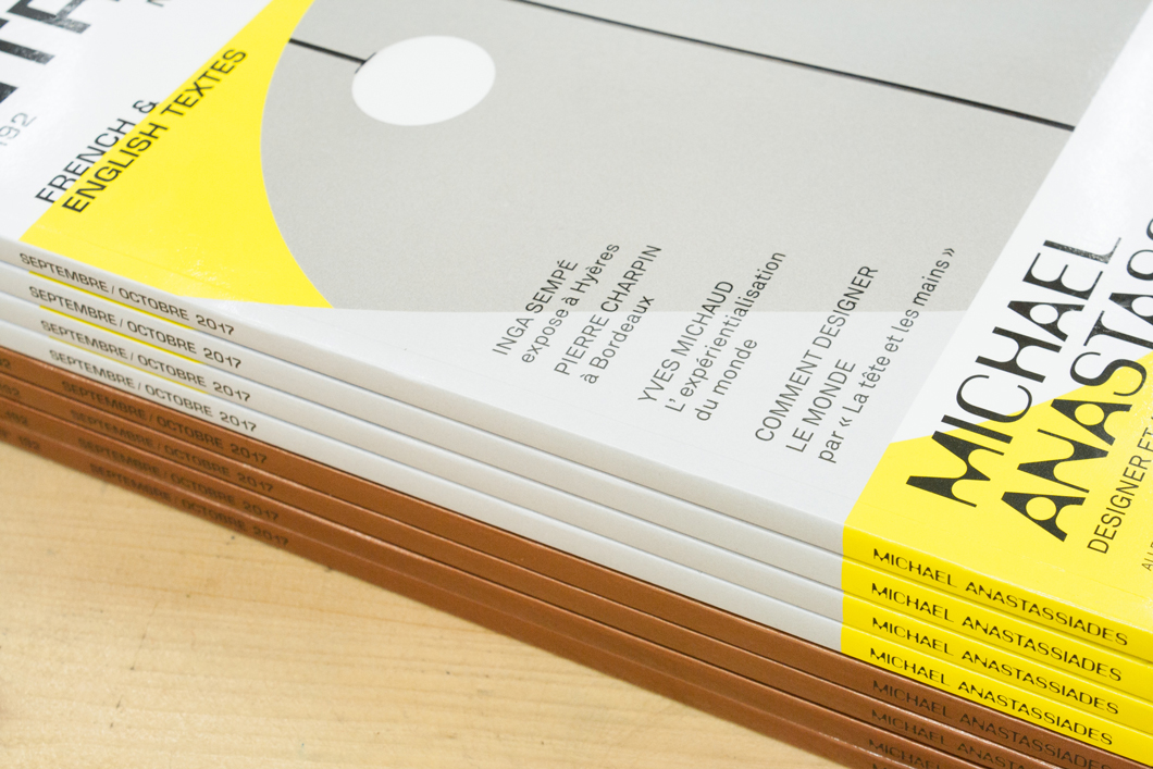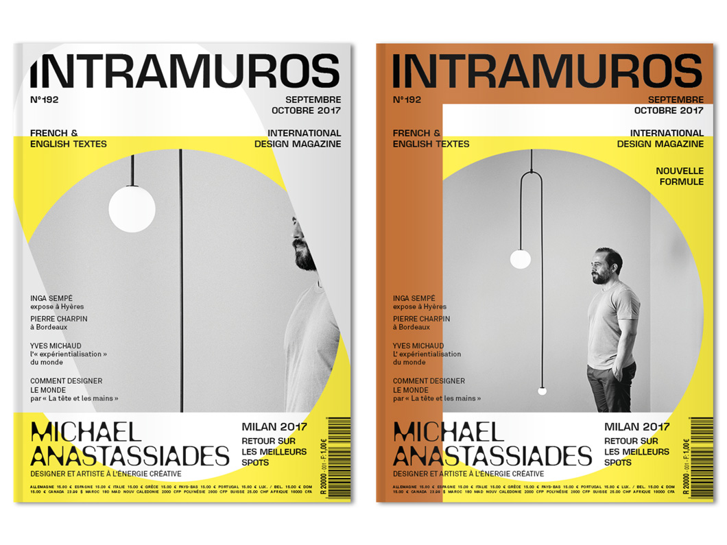 Depuis 1985 il est le seul magazine français, bilingue exclusivement consacré à l’actualité du design dans l’ensemble de ses applications. Le travail de refonte s’articule avec une nouvelle formule de maquette et le dessin d’un nouveau logotype. Sur la base de La typographie Eurostile dessinée par Aldo Novarese en 1962, icône du progrès et populaire a été créée l’INTRAMUROS. La nouvelle identité est basée sur des choix chromatiques en tons directs, des couleurs vives, et un schématisation de silhouettes géométriques qui se déploient sur l’intégralité de la maquette. Des jeux de « plans » superposés évoquant les projections orthogonales qui schématisent en trois vues 2D un objet en volume. Les formes créées permettent de révéler ainsi des signes cachés. L’approche sculpturale de la typographie renforce ce parti‐pris de mise‐en‐volume des images. Un dessin de caractère de titrage exclusif pour chaque numéro inspiré du travail du designer phare. Des illustrations viennent ponctuer et retranscrire l’ambiance de chaque numéro.