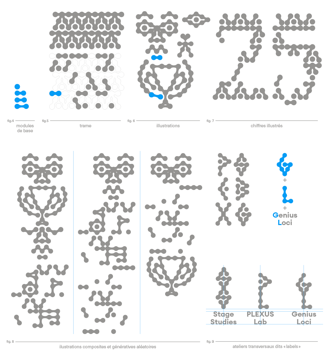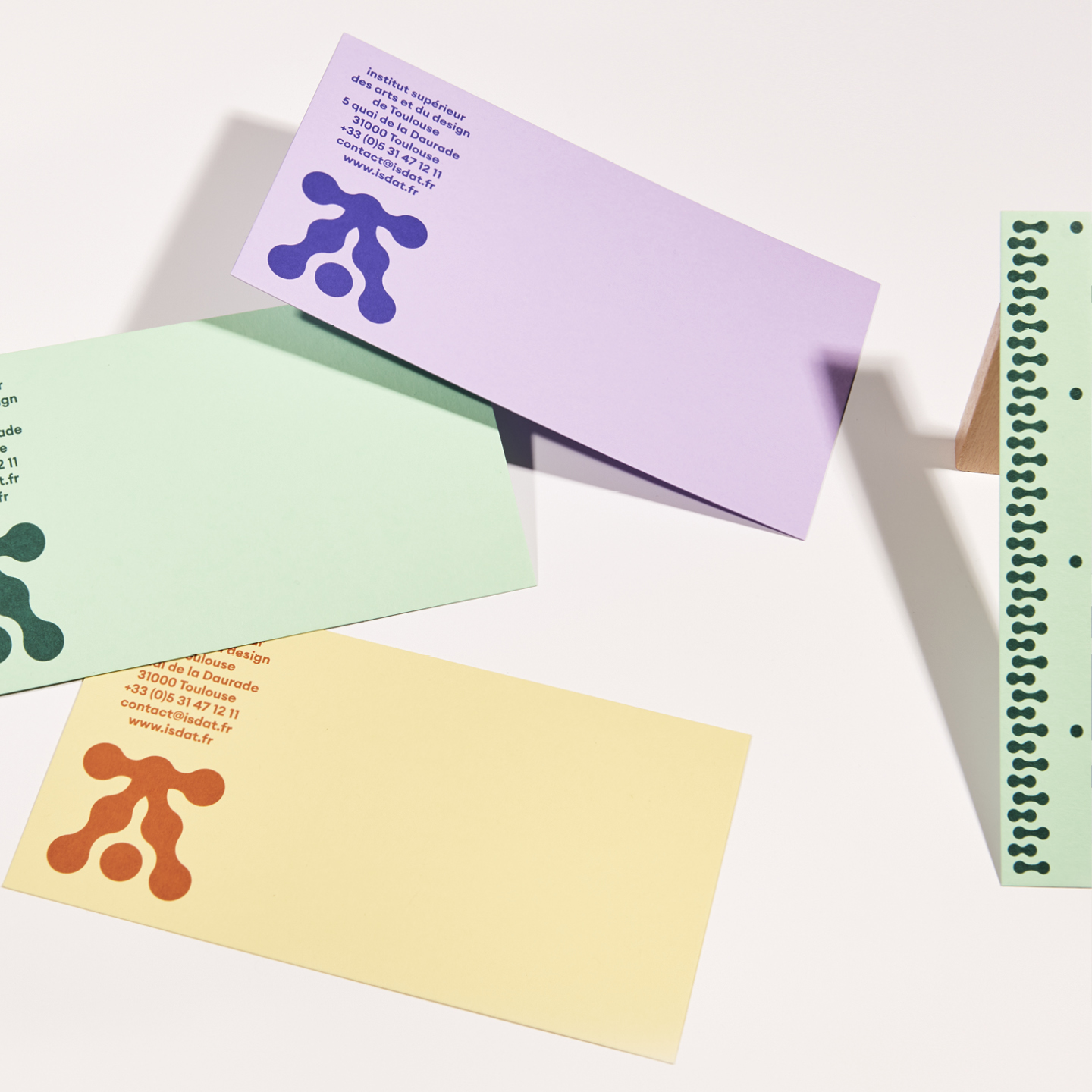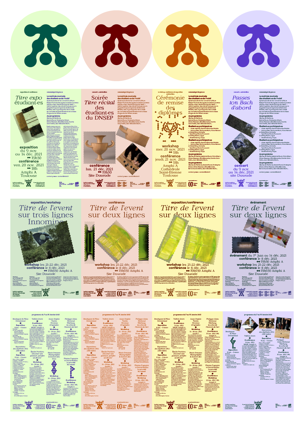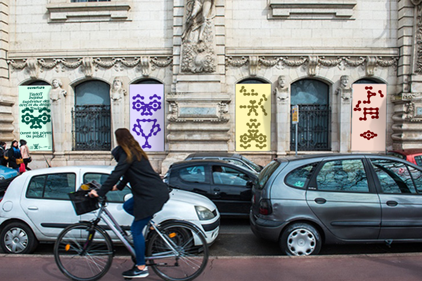Nouvelle identité autour d’un signe‐totem construit de modules organiques et anthropomorphes. Le signe est composé à partir de modules‐maillons qui s’inter-connectent à partir d’un centre névralgique. L’école se démarque par une formation transversale : les ateliers transversaux entre différents médiums (musique + danse + design graphique, …) représentés ici sous des « labels ». Mascotte : l’homme de Vitruve, l’homme de l’isdaT : allégorie de l’humanisme à l’ère de la mutualisation et de la transversalité.