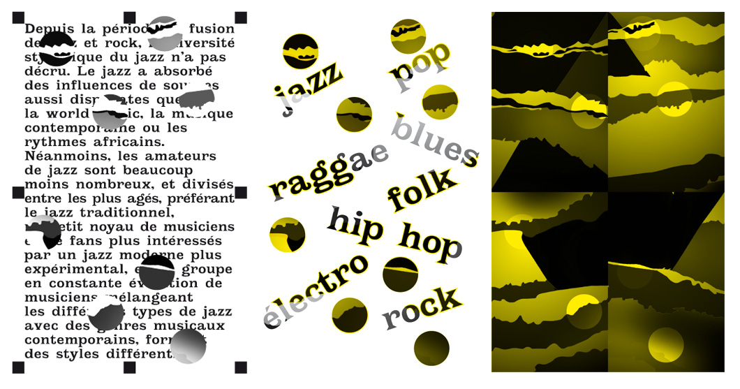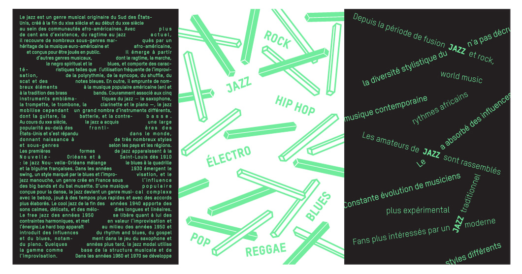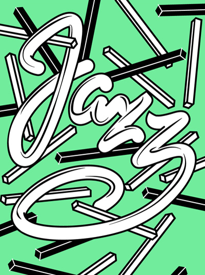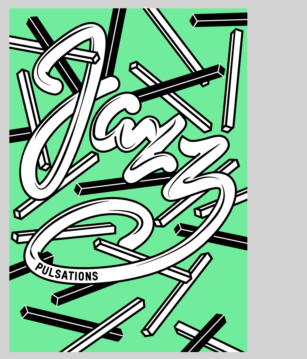 01 : Un lettrage Jazz très pop tout en rondeur danse avec des notes de piano en lévitation. Typographie : T‑star pro par Michael Mischler 02 : Un Jazz plus folk‐rock évoque des paysages lunaires. Typographie : Bishop par Quentin Schmerber