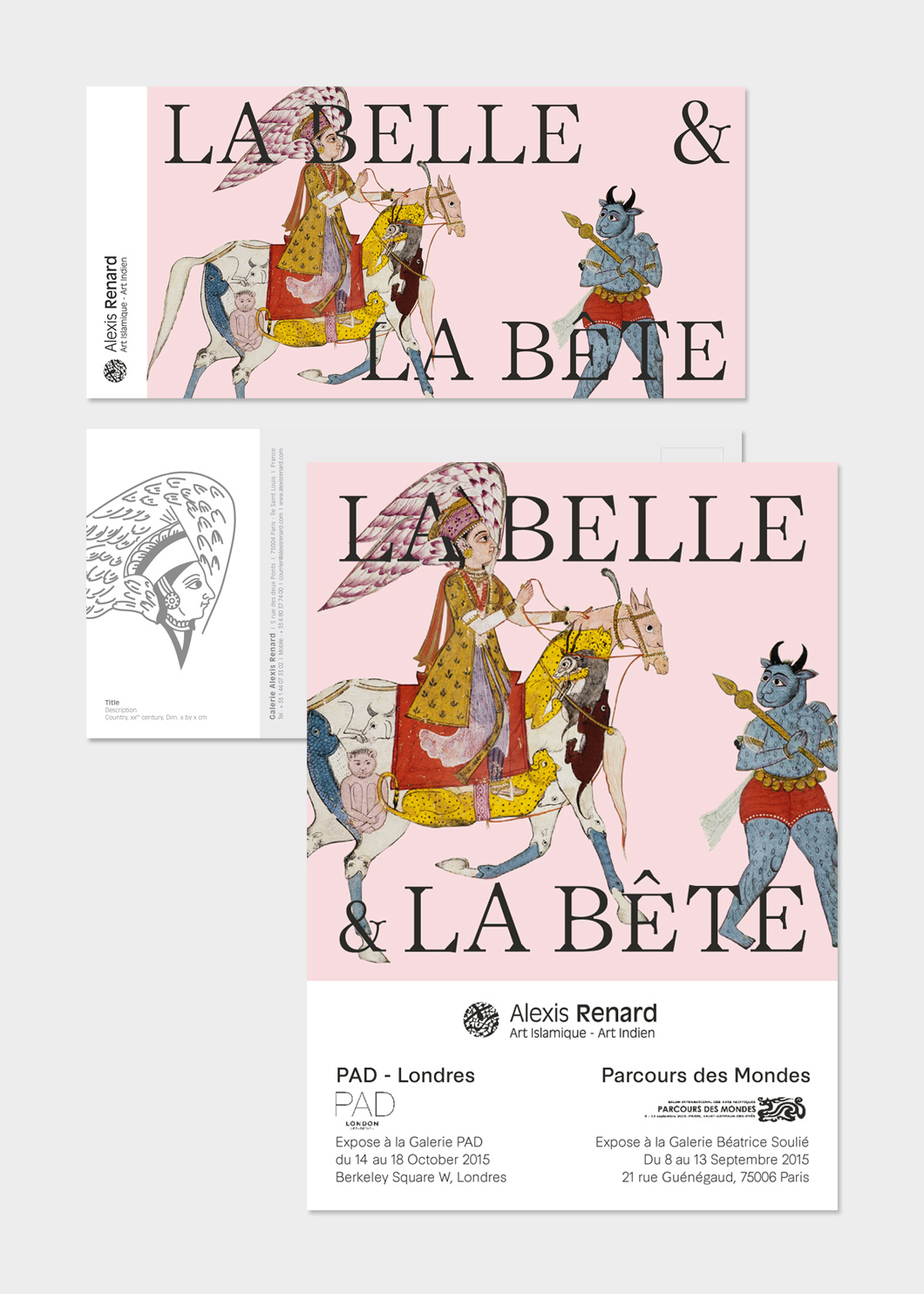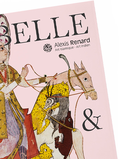 Catalogue d’exposition Alexis Renard, galerie d’art Islamique et Indien . 2015 – Catalogue d’œuvres d’art autour du thème féérique du conte de la Belle et la Bête. Création d’une typographie néo‐classique (Belbete), illustrations au trait et aplats de couleur. – édition, catalogue d’art, typographie.