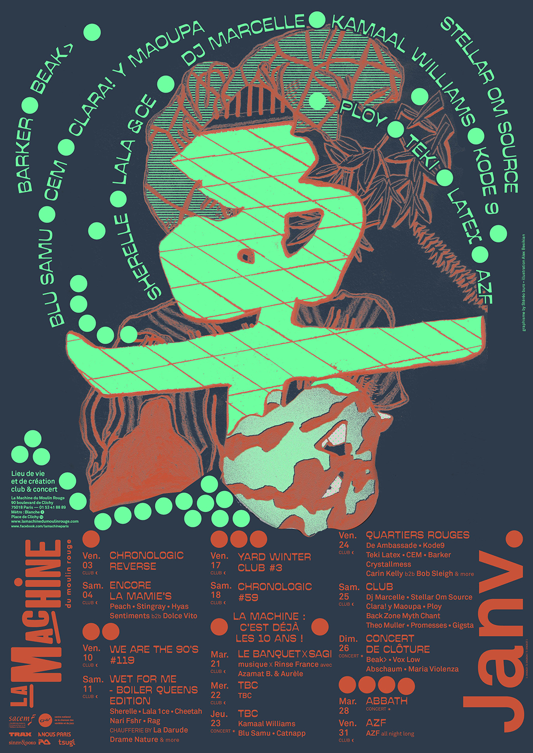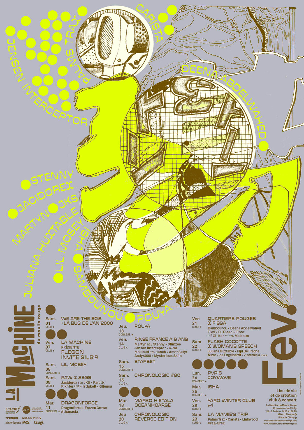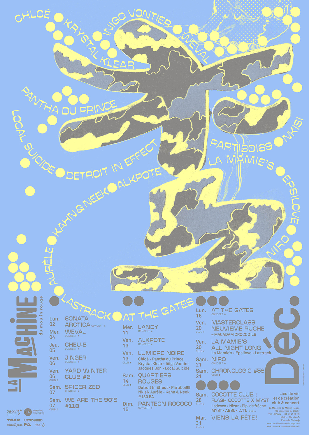 Pour la saison hivernale 2019–2020 de La Machine du moulin rouge, nous avons travaillé avec les illustrations d’Alex Besikian et avons joué avec l’ambigüité entre signes typographiques et signes figuratifs : un homme qui danse ou ou machine en ébullition.