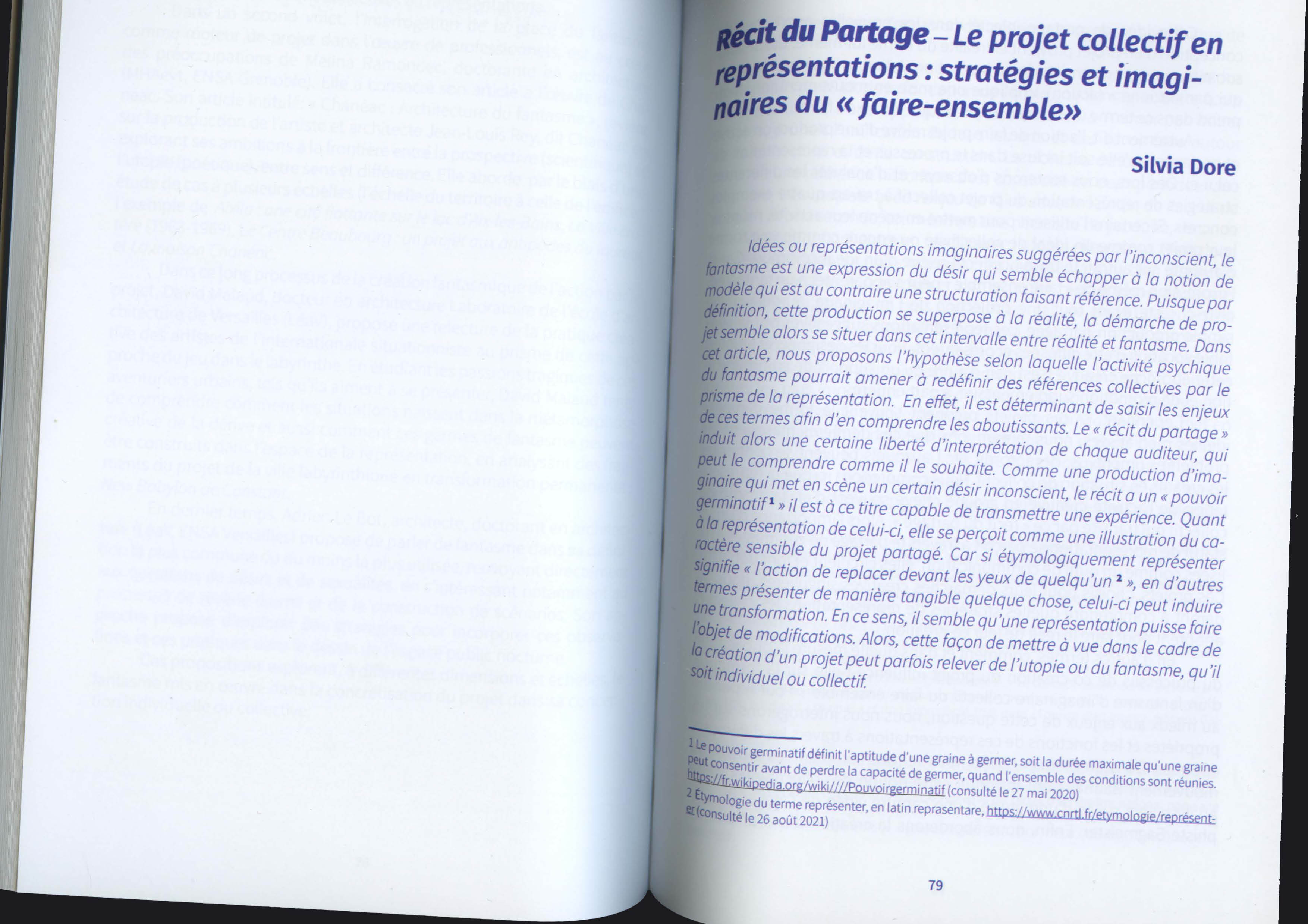 En effet, il est déterminant de saisir les enjeux de ces termes afin d’en comprendre les aboutissants. Le « récit du partage » induit alors une certaine liberté d’interprétation de chaque auditeur, qui peut le comprendre comme il le souhaite. Comme une production d’imaginaire qui met en scène un certain désir inconscient, le récit a un « pouvoir germinatif » (((Le pouvoir germinatif définit l’aptitude d’une graine à germer, soit la durée maximale qu’une graine peut consentir avant de perdre la capacité de germer, quand l’ensemble des conditions sont réunies. https://fr.wikipedia.org/wiki////Pouvoirgerminatif (consulté le 27 mai 2020))) il est à ce titre capable de transmettre une expérience. Quant à la représentation de celui‐ci, elle se perçoit comme une illustration du caractère sensible du projet partagé. Car si étymologiquement représenter signifie « l’action de replacer devant les yeux de quelqu’un » (((Étymologie du terme représenter, en latin reprasentare, https://www.cnrtl.fr/etymologie/repr%C3%A9senter (consulté le 26 août 2021))), en d’autres termes présenter de manière tangible quelque chose, celui‐ci induit également la perception de l’abstraction par excellence. Alors, cette façon de mettre à vue, dans le cadre de la création d’un projet, peut parfois relever du fantasme, qu’il soit individuel ou collectif.