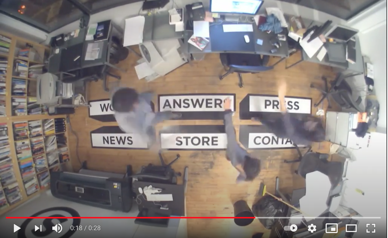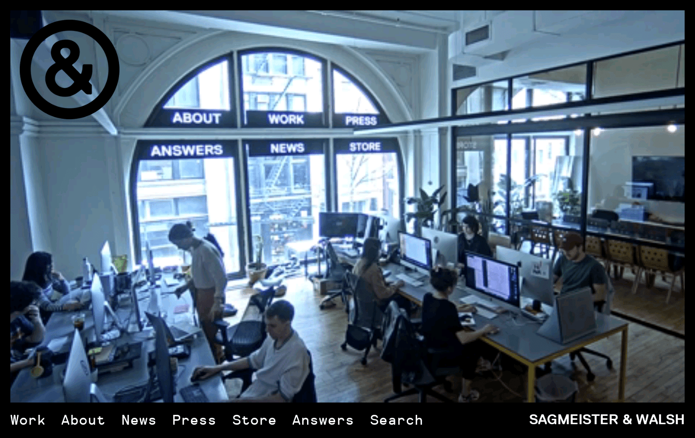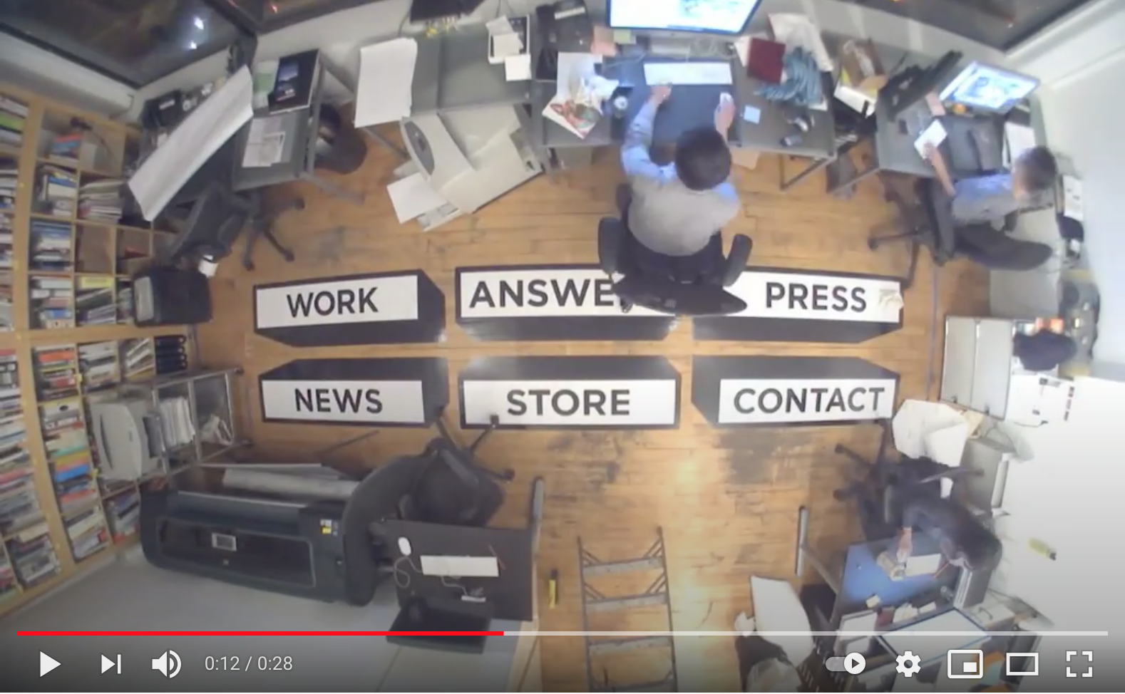 Dans un tout autre registre, il semble pertinent de s’intéresser au travail du designer graphique Stefan Sagmeister, pour la singularité de sa démarche et la représentation médiatisée du réel avec les captures vidéo de son atelier. Ce projet, commencé dans les années 2000, se matérialisait par un enregistrement vidéo constant des employés de son agence. (((Page d’accueil du site de Sagmeister, https://www.youtube.com/watch?v=qTg6Gl3gD8M (consulté le 23 mai)))) Le travail quotidien et collectif était filmé 24 heures sur 24 à l’aide d’une caméra fixée au plafond. L’activité du studio était donc retranscrite en direct, sur la page d’accueil du site web, afin de créer un lien continuel entre les visiteurs du site et les designers. Quant à la navigation sur ce même site web, elle se faisait via des « boutons » en vinyle collés sur le plancher.