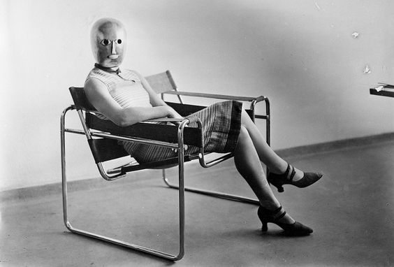 Figure 2 – Mise en scène du siège Wassily,1926. Masque de théâtre d’Oskar Schlemmer, robe de Lis Beyer‐Volger, fauteuil Wassily de Marcel Breuer, photographie de Erich Consemüller.