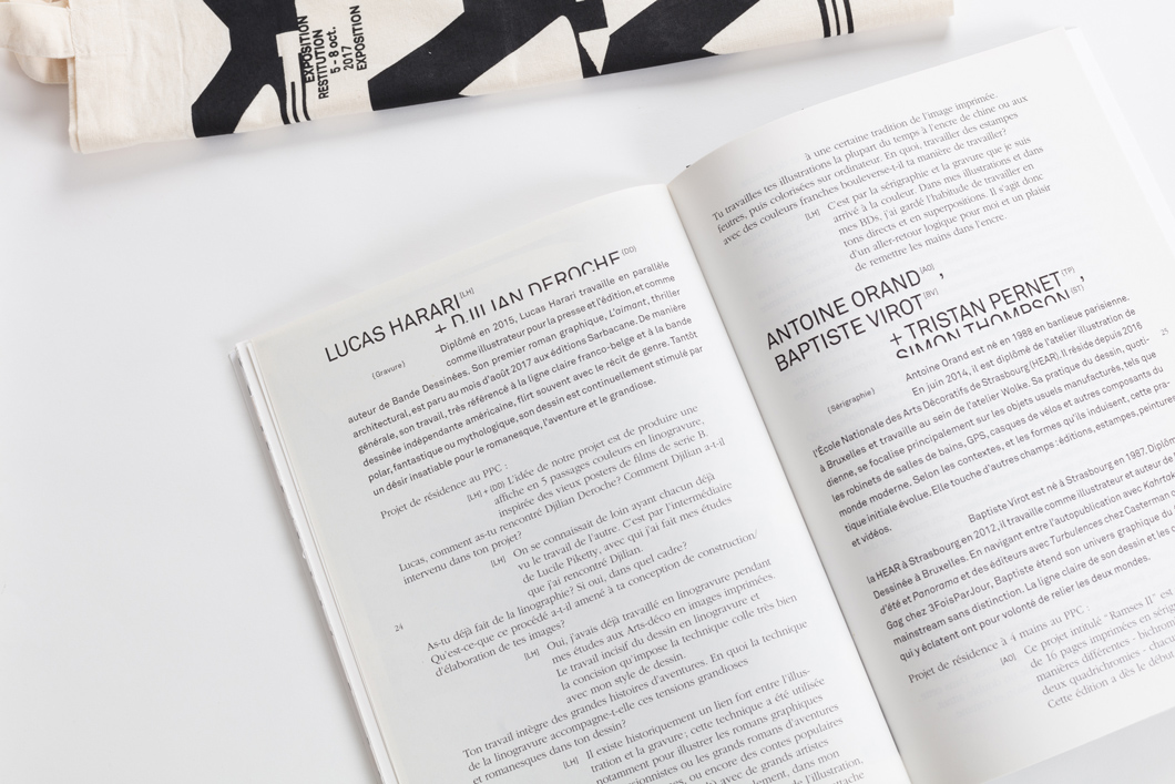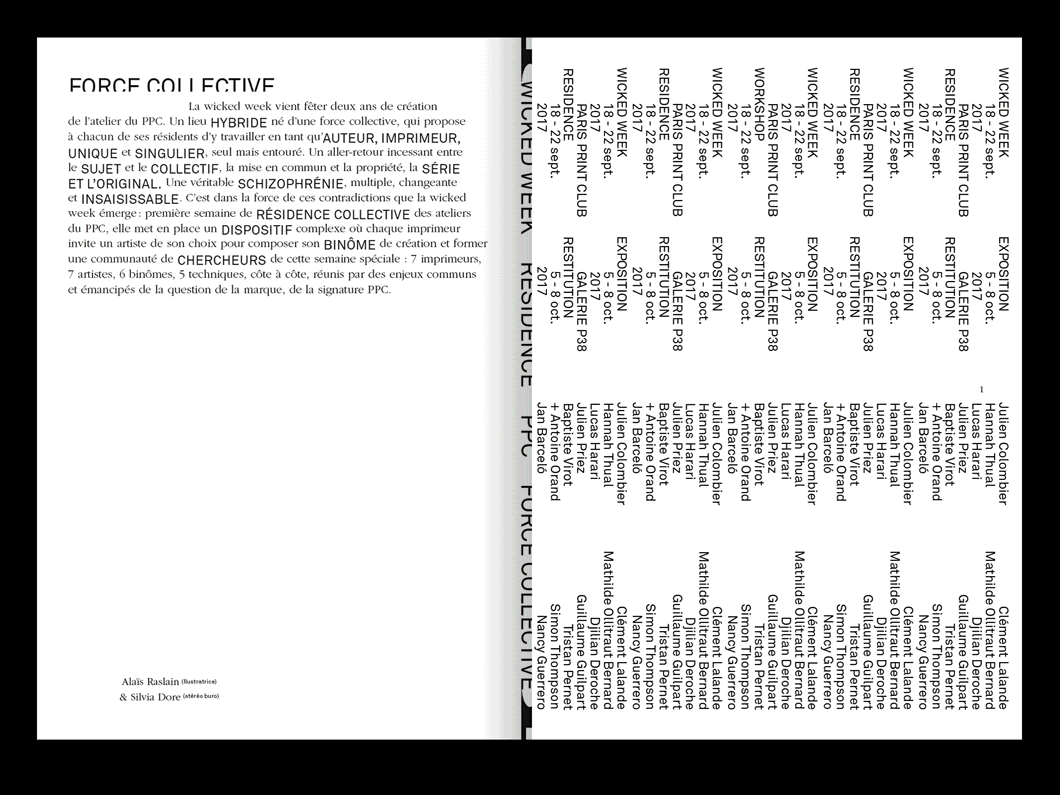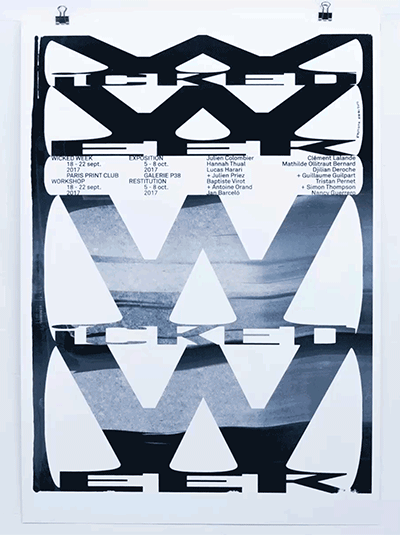Une semaine de résidence « Wicked week » initiée par le Paris Print Club, atelier collectif dédié à l’image et à l’objet imprimé. Une dizaine d’artistes internationaux ont été invités par les 6 artisans imprimeurs. Nous avons réalisé l’identité visuelle et le catalogue de la restitution de cette résidence. Nous avons joué sur la répétition des lettres « W » en signifiant les rouleaux encreurs des imprimeurs. Un objet catalogue qui questionne les limites du statut du livre d’artiste par un procède de reproduction économique en dialogue avec les estampes originales des artistes.